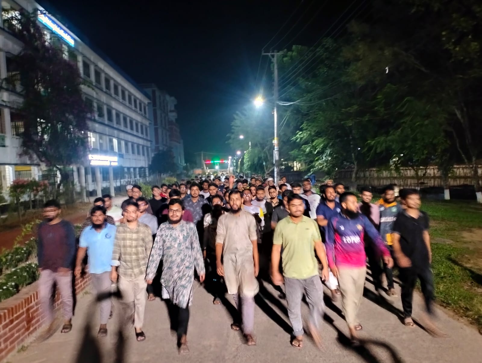 শুক্রবার (২৪অক্টোবর) রাত ১১ টার দিকে বিশ্ববিদ্যালয়ের হল প্রাঙ্গণ থেকে বিক্ষোভ মিছিল শুরু হয়। পরে মিছিলটি পুরো ক্যাম্পাস প্রদক্ষিণ করে ছাত্র শিক্ষক কেন্দ্রের (টিএসসি) সামনে এসে শেষ হয়।এ সময় শিক্ষার্থীরা ‘ইসকন তুই জঙ্গি, স্বৈরাচারের সঙ্গী’, ‘শাহজালালের বাংলায়, ইসকনের ঠাঁই নাই’, ‘মোদীর সন্তানেরা’, ‘হুঁশিয়ার সাবধান’, ‘দিল্লী না ঢাকা, প্রভৃতি স্লোগান দিতে থাকেন।