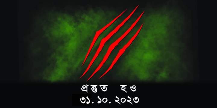 সবুজ রঙের পোস্টারটিতে রয়েছে অনেকটা ধনুক আকৃতির লাল রঙের চারটি রেখা। আর নিচে লেখা রয়েছে ‘প্রস্তুত হও। ৩১.১০.২০২৩’।