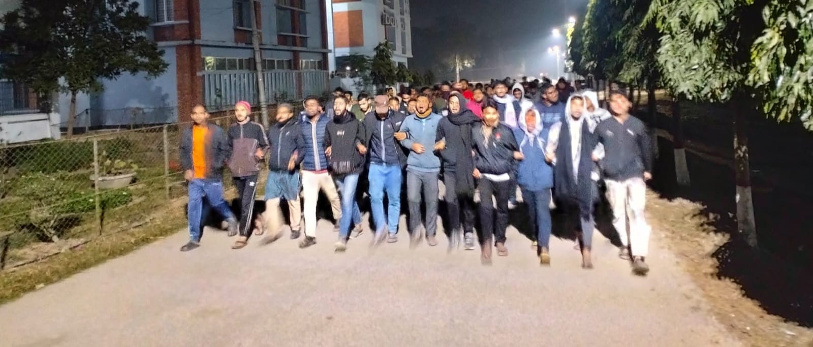 বুধবার (২৯ জানুয়ারি) রাত দশটায় ছাত্র হল প্রাঙ্গণ থেকে বিক্ষোভ মিছিল বের করে শিক্ষার্থীরা। মিছিলটি বিশ্ববিদ্যালয়ের প্রধান সড়ক হয়ে প্রশাসনিক ভবনের পাশে গিয়ে শেষ হয়। এ সময় শিক্ষার্থীরা ফ্যাসিবাদবিরোধী বিভিন্ন স্লোগান দেন। বিক্ষোভ মিছিলে বিভিন্ন অনুষদের শতাধিক শিক্ষার্থী অংশগ্রহণ করেন।
