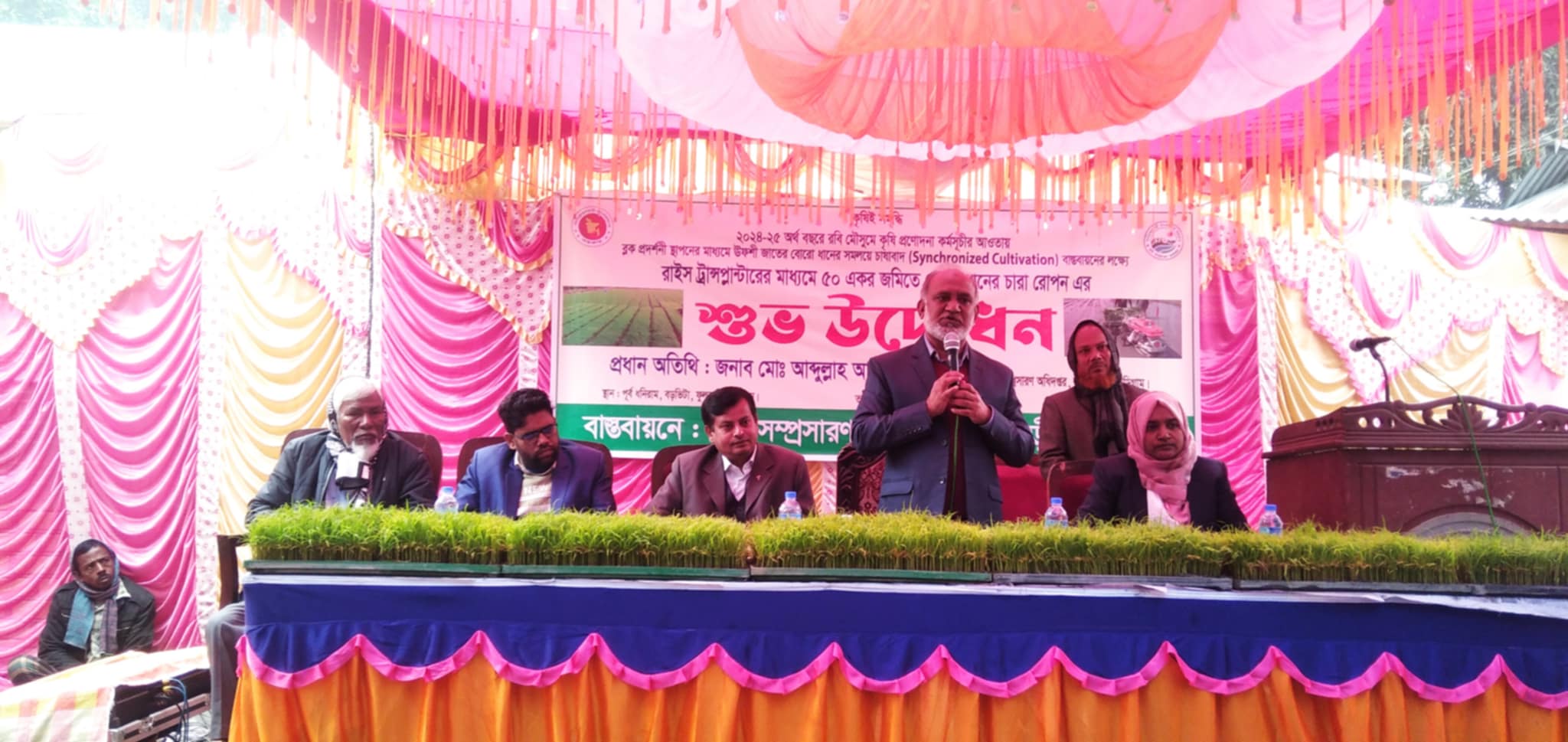 উপজেলার বড়ভিটা ইউনিয়নের পূর্ব ধনিরাম গ্রামের শাহবাজার এলাকার কৃষক সফিয়ার রহমানের বাড়ীতে সকাল ১১ টায় এ কার্যক্রমের উদ্বোধন করা হয়। উপজেলা কৃষি অফিসার নিলুফা ইয়াসমিনের সভাপতিত্বে অনুষ্ঠিত উদ্বোধনী সভায় প্রধান অতিথি হিসেবে বক্তব্য রাখেন কৃষি সম্প্রসারণ অধিদপ্তর, খামারবাড়ি, কুড়িগ্রামের উপ-পরিচালক মো:আব্দুল্লাহ আল মামুন, বিশেষ অতিথি, অতিরিক্ত উপ- পরিচালক (শস্য) আসাদুজ্জামান। সভায় আরও বক্তব্য রাখেন, উপজেলা মৎস্য কর্মকর্তা হাফিজুর রহমান, সমলয় প্রকল্পের সভাপতি শফিয়ার রহমান রব্বানী, কৃষকের পক্ষে অধ্যক্ষ নূর মোহাম্মদ মিয়া। অনুষ্ঠানটি সঞ্চালনা করেন উপজেলা উপসহকারী কৃষি কর্মকর্তা আশরাফুল আলম।