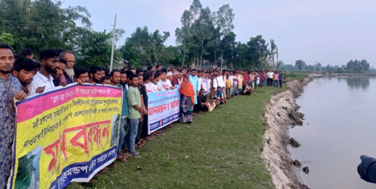 রবিবার (৭ সেপ্টেম্বর) বিকাল ৫ টা থেকে ৬ টা পর্যন্ত ঘন্টাব্যাপী উপজেলার নাওডাঙ্গা ইউনিয়নের দক্ষিণ চরগোরকমন্ডল এলাকার ধরলা নদীর পাড়ে এ মানববন্ধন অনুষ্ঠিত হয়।
