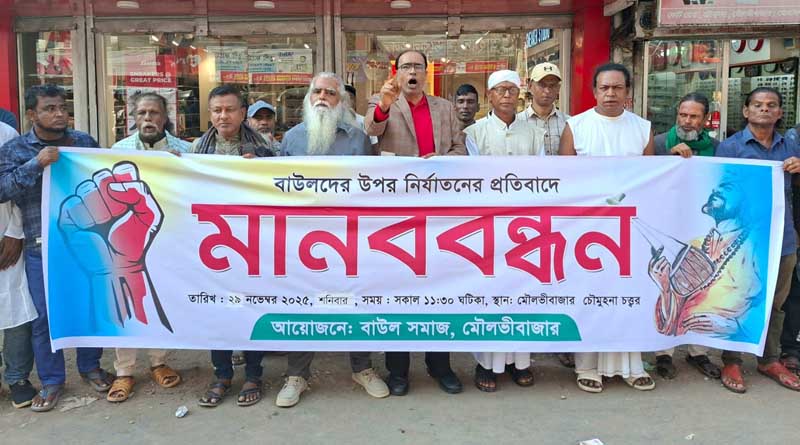 মৌলভীবাজারে বাউলদের উপর চলমান নির্যাতনের প্রতিবাদে বাউল সমাজ মৌলভীবাজার-এর উদ্যোগে মানববন্ধন অনুষ্ঠিত হয়েছে।