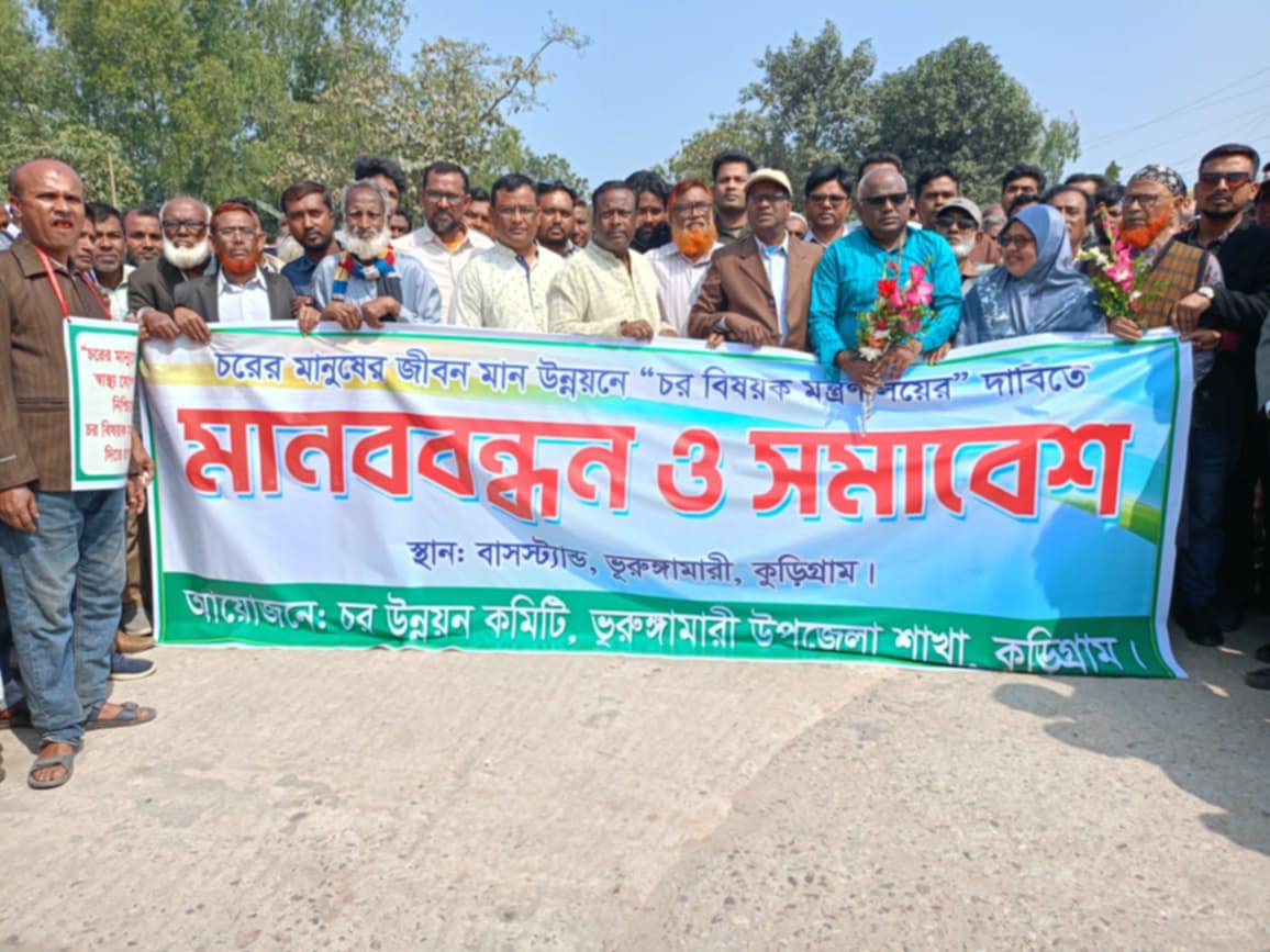 বুধবার (২৬ ফেব্রুয়ারী)সকাল ১১টায় জেলার  ভূরুঙ্গামারী বাসস্ট্যন্ড মোড়ে চর উন্নয়ন ভূরুঙ্গামারী উপজেলা  কমিটির উদ্যোগে মানববন্ধন ও সমাবেশ অনুষ্ঠিত হয়। ভূরুঙ্গামারী উপজেলা চর উন্নয়ন কমিটির আহবায়ক মো: রফিকুল ইসলামের সভাপতিত্বে ও সদস্য সচিব ইসমাইল হোসেন ইউসুফের সঞ্চালনায় প্রধান অতিথি হিসেবে বক্তব্য রাখেন, কুড়িগ্রাম জেলা চর উন্নয়ন কমিটির আহবায়ক, শিক্ষাবিদ ও সাংবাদিক মো: শফিকুল ইসলাম বেবু, বিশেষ অতিথি হিসেবে বক্তব্য রাখেন চর উন্নয়ন কমিটি কুড়িগ্রাম জেলার  সদস্য সচিব সাংবাদিক আশরাফুল হক রুবেল, যুগ্ম আহবায়ক, সাংবাদিক সাইয়েদ আহমেদ বাবু, ডাক্তার মারুফ, ভূরুঙ্গামারী উপজেলা বিএনপির সাবেক সভাপতি কাজি গোলাম মোস্তফা,নাগেশ্বরি উপজেলা বিএনপির সাবেক সাধারণ সম্পাদক আজহারুল ইসলাম আল আমিন, ভূরুঙ্গামারী উপজেলা বিএনপির সাবেক সাধারণ সম্পাদক মো: রফিকুল ইসলাম, খন্দকার গোলাম ফারুক প্রমূখ।