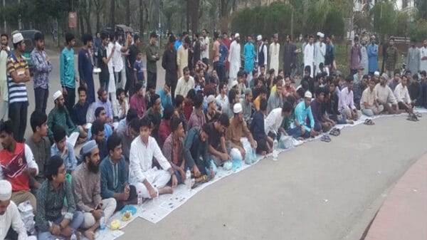 এ কর্মসূচির আয়োজন করেন তারা। এর আধা ঘণ্টা আগে থেকেই হাতে ইফতারসামগ্রী নিয়ে শিক্ষার্থীরা গোলচত্বরে জড়ো হতে থাকেন। পত্রিকার কাগজ ও জায়নামাজ বিছিয়ে সারিতে বসেন। ইফতারের আগে তাদের কয়েকজন হামদ-নাত পরিবেশন করেন।
