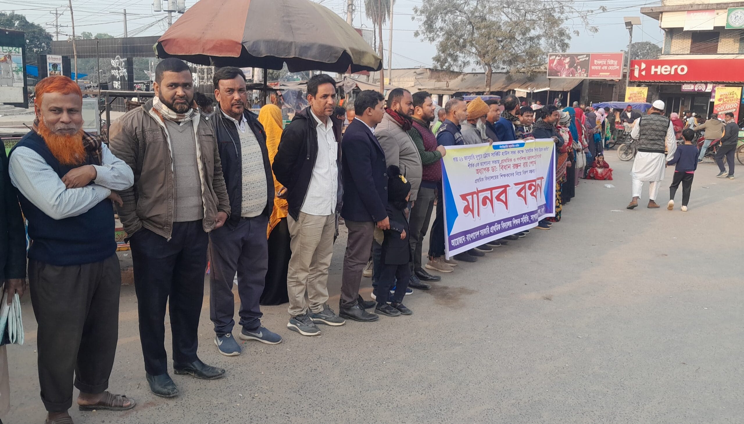 বুধবার বিকেল ৪ টায় সাপাহার জিরো পয়েন্টে শিক্ষক সমিতির শিক্ষক শিক্ষিকাগণ একযোগে এই মানববন্ধন করেন।