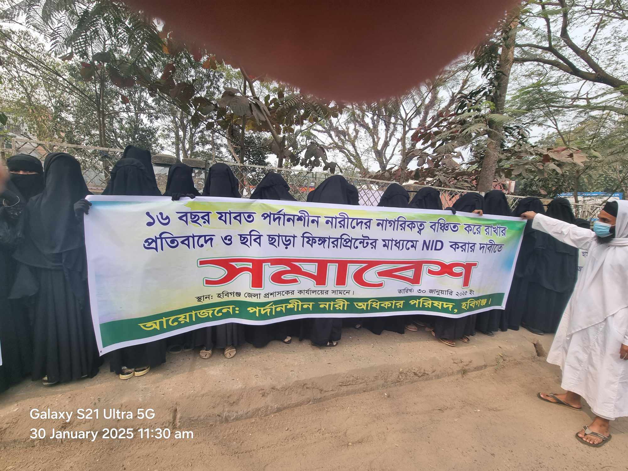 ৩০ জানুয়ারি রোজ বৃহস্পতিবার বেলা এগারোটায় ‘পর্দানশীন নারী অধিকার পরিষদ’ হবিগঞ্জ জেলা প্রশাসক কার্যালয়ের সামনে মুখচ্ছবি ছাড়া নির্ভরযোগ্য শনাক্তকরণ পদ্ধতি ফিঙ্গারপ্রিন্ট এর মাধ্যমে এনআইডি ও অন্যান্য পরিচয়পত্র চেয়ে সমাবেশ করেন।
